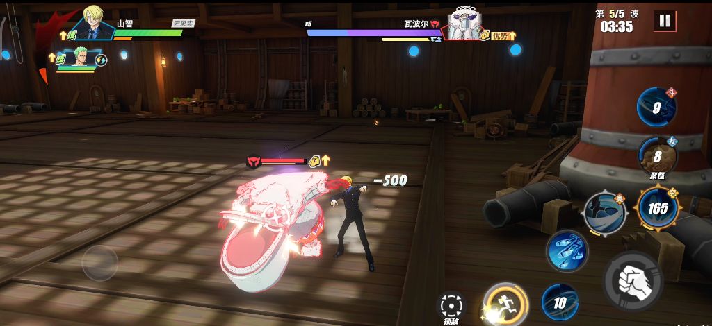 胖子瓦波尔的【冲击大嘴】发动时,会有很明显的动作,这时大家要往后拉开距离,或者直接闪避他的背后,接着再利用这个时间进行无伤输出。刚开始不建议大家直接释放奥义,因为在受到伤害后,胖子瓦波尔会吃东西补充生命值。这里大家如果使用艾斯的话,可以利用强控技能打断他。