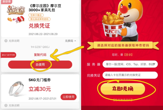 4,会跳到摩尔庄园X宅急送的联名网页,之后选择服务器,把复制的兑换凭证粘贴,并用手机号登陆,会得到一串新的号码,打开摩尔庄园在活动-福利-神奇密码处输入新的兑换号码,就可以得到一套KFC桌椅啦!!