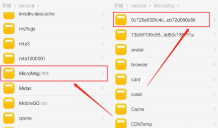 然后我们在tencent文件夹中找到MicroMsg文件夹并点击,找到类似于图中这个文件夹的文件夹,每个人的可能名字不一样。