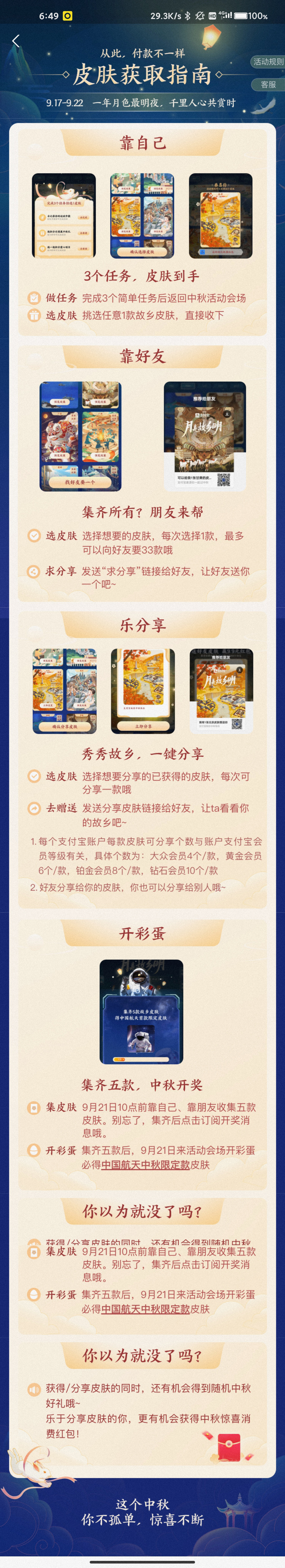 航天皮肤是支付宝最新推出的“月是故乡明”活动中,玩家们要是获得5块地方皮肤就可以兑换一个航天中秋限定皮肤。