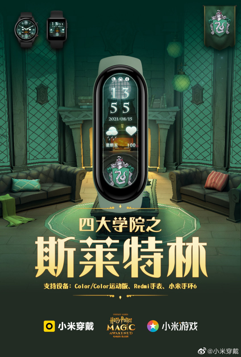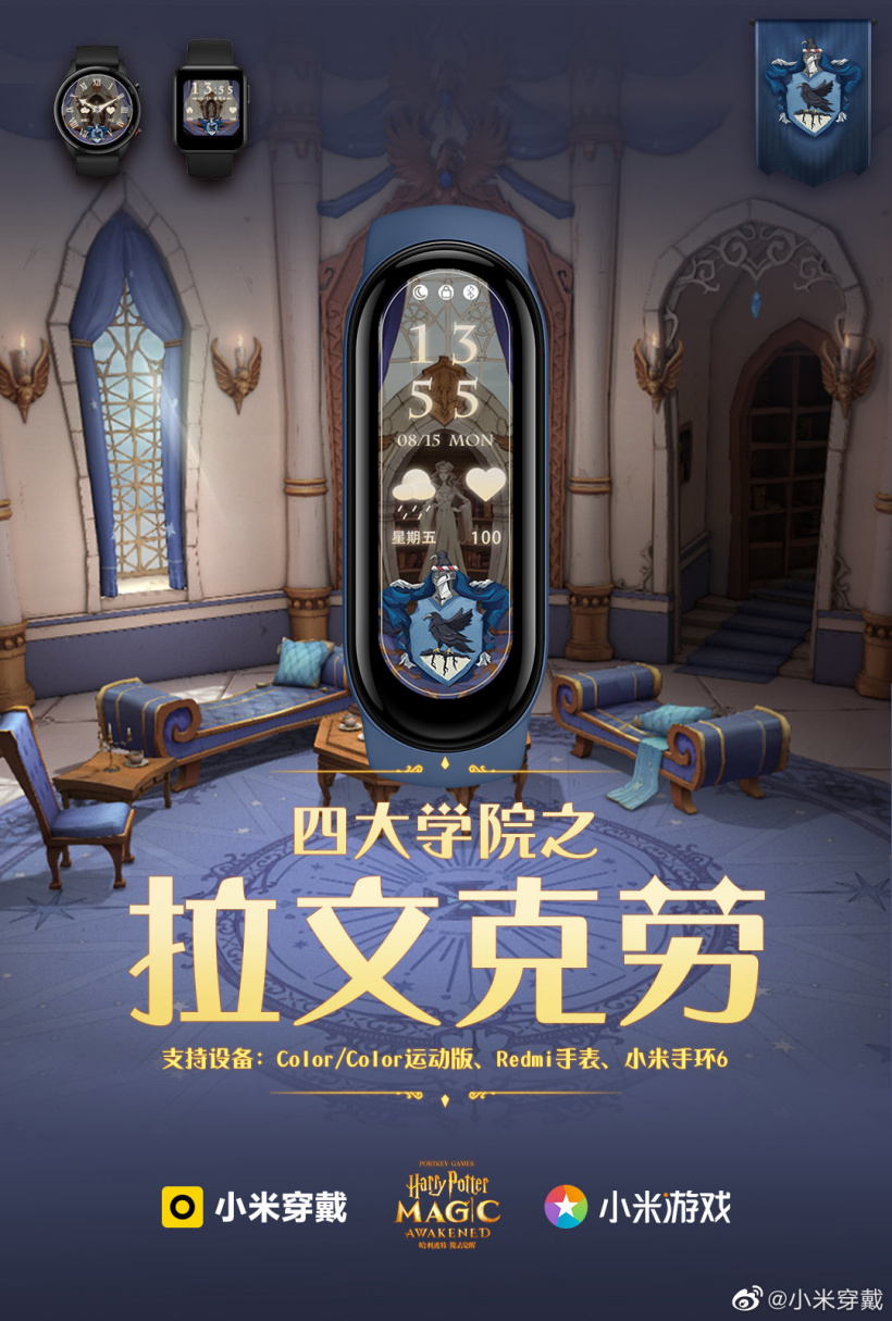 哈利・波特四大学院魔法表盘适配的小米手环型号有四款,分别是:小米手环 6、Color/Color 运动版智能手表以及Redmi 手表,拥有这四款手环的用户可以在小米穿戴app中进行表盘更换,具体领取方法继续往下看吧。