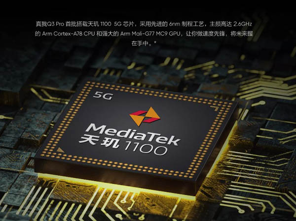 realme Q3Pro搭载着天机1100处理器+LPDDR4X+UFS3.1,配置Dolby Atmos 立体双扬声器+3175mm²超大 VC 散热面积+Tactile Engine 线性马达,不支持NFC+红外。