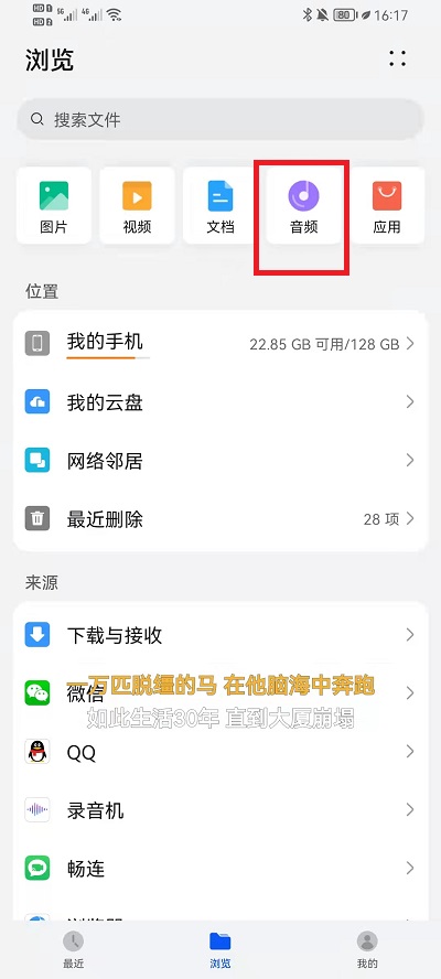 3、在手机文件管理中,点击【音频】即可查看到本地的音乐文件;