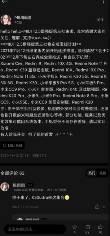 注:由于第三批机型较多,机型的外发时间会有些差别,还没收到升级的米粉朋友还请耐心等待。部分功能、服务以及优化效果可能因系统版本、手机型号不同存在差异,请以实际为准。