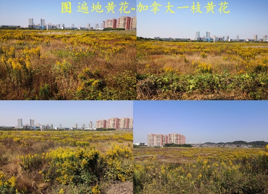 “加拿大一枝黄花” 花形色泽亮丽,其实是一种恶性杂草,外来的物种。耐旱、耐瘠薄,风媒传播能力强,已广泛出现在武汉市城乡绿化区域、农田、撂荒地、高速、国道、公路等沿线,呈爆发态势。因为没有天敌制约,