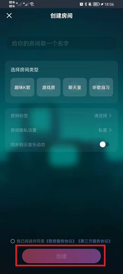3、我们需要选择房间类型还有名字等,然后点击下方同意协议,点击创建就可以了。