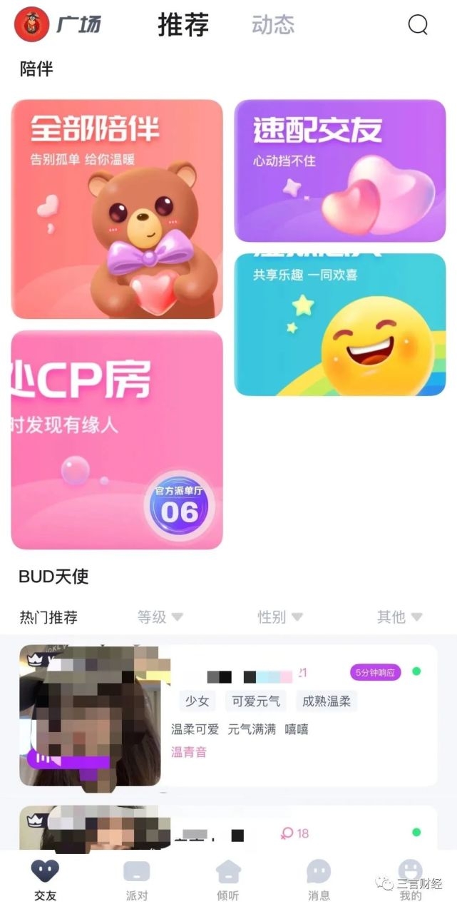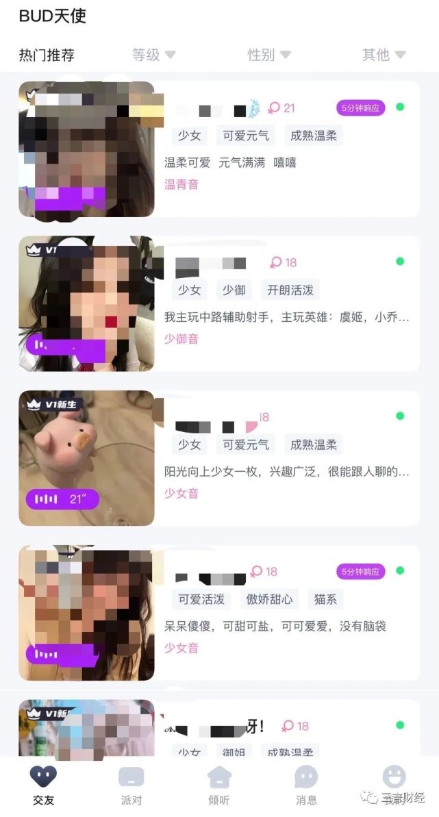 这款应用主打的也仍然是陌生人社交,不过不像前面那款,用户并不需要打造一个虚拟形象,而是直截了当的选择交友方式。这款应用除了提供传统陌生社交中的匹配交友聊天外,还提供了语音直播和有偿陪聊、陪玩服务。