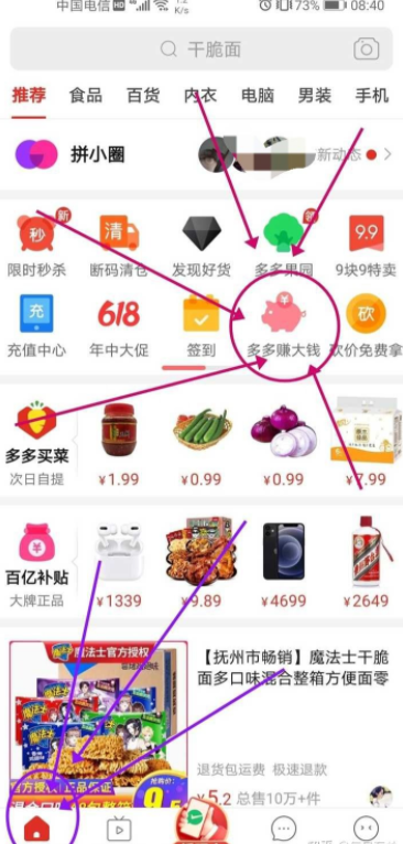 1,打开拼多多APP,首页的部位点击【多多赚大钱】进入,注意记住这个入口,其他的入口都是用来混淆的;