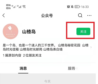 3、之后点击【关注】关注山楂岛,进入到公众号中;