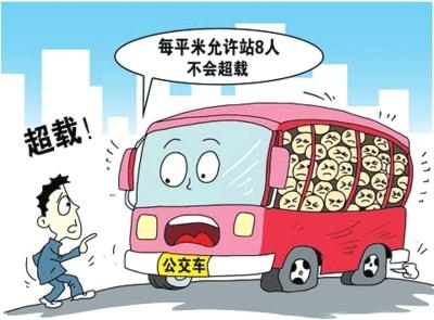按照国家建设部对公交车限载的国家标准是8人/平方米,按照这个标准,公交车上一般要超过80人以上才属于超载,事实上,公交车再挤,1平方米也很难挤下8人,因此再拥挤的公交车都算不上超载。