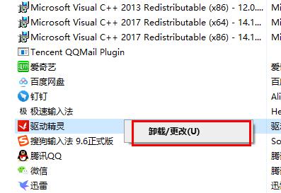 4、在卸载任务栏中找到“驱动精灵”,右击选择“卸载”。