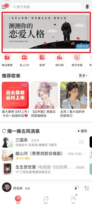1、首先需要更新到最新的网易云音乐版本(8.6.26.192734),然后打开软件,进入到软件的首页界面中,在首页界面中,上方的轮播大概第三个的样子,就会出现【测测你的恋爱人格】,然后我们点击进入就可以;