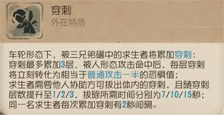 破轮的普攻是用武器攻击,可造成普通伤害。一技能“致残打击”能使击中的求生者在一段时间内移动速度大幅降低,这在追击时非常关键,能有效限制求生者的行动,方便后续追击。二技能“轮斩”是其核心技能,破轮会冲向目标并旋转武器进行多段伤害,伤害可观。且在使用“轮斩”后,一段时间内破轮自身移速会加快,便于追击和转点。
